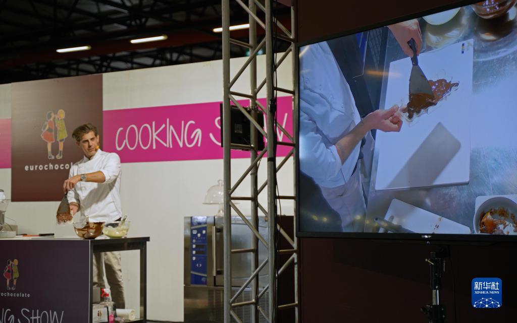 10月15日,一名甜品师在意大利佩鲁贾“欧洲巧克力节”上现场制作巧克力。