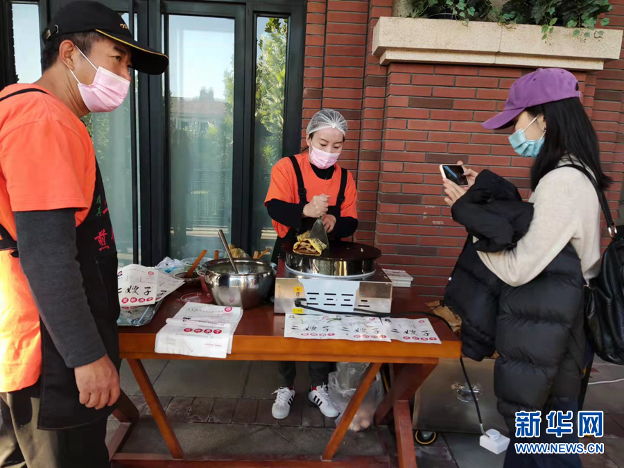 10月21日,“中国有约”2021年国际媒体主题采访记者团一行来到天津市,探访坐落于和平区民园广场二层的非物质文化遗产展览博物馆。图为厨师现场制作天津非遗“二嫂子”煎饼果子。新华网 奥田真理子 摄