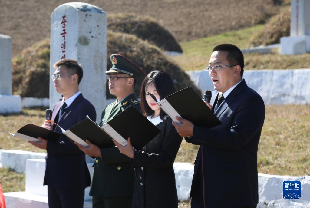 10月23日,在朝鲜咸镜南道西北部长津湖畔的长津邑中国人民志愿军烈士合葬墓地,中国驻朝鲜大使馆外交官代表朗诵献给长眠于此的志愿军英烈的祭文。新华社记者 江亚平 摄