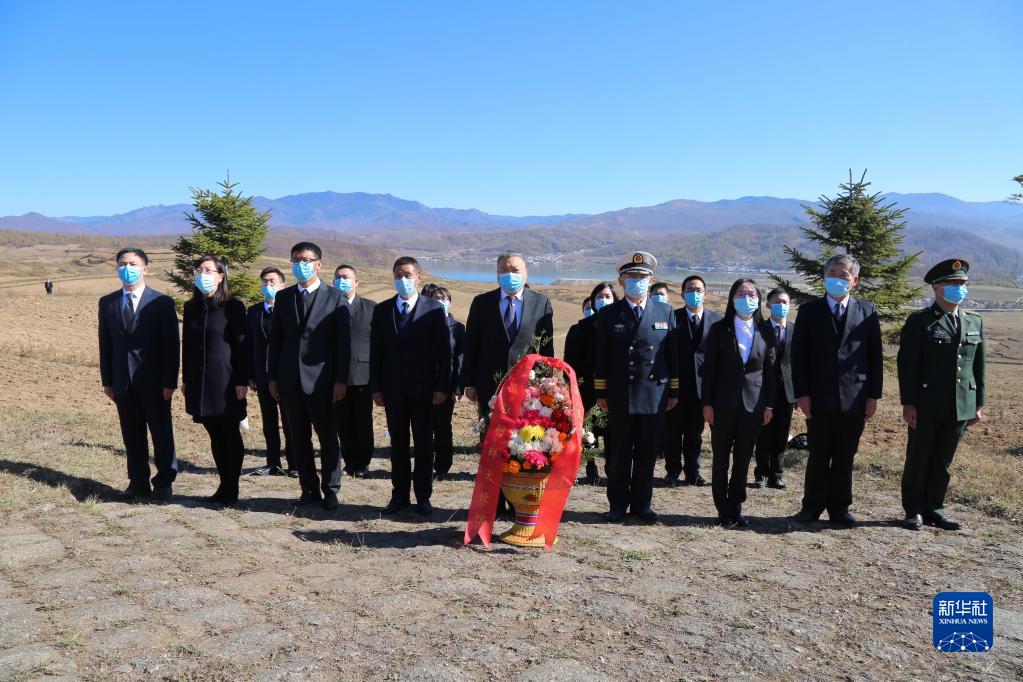10月23日,在朝鲜咸镜南道西北部长津湖畔的长津邑中国人民志愿军烈士合葬墓地,中国驻朝鲜大使馆外交官向烈士献花并默哀致敬。新华社记者 江亚平 摄