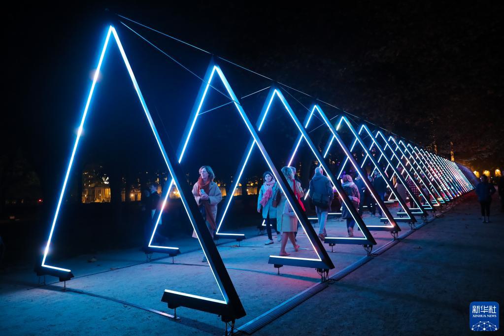 10月28日,人们在比利时布鲁塞尔参观灯光艺术作品。