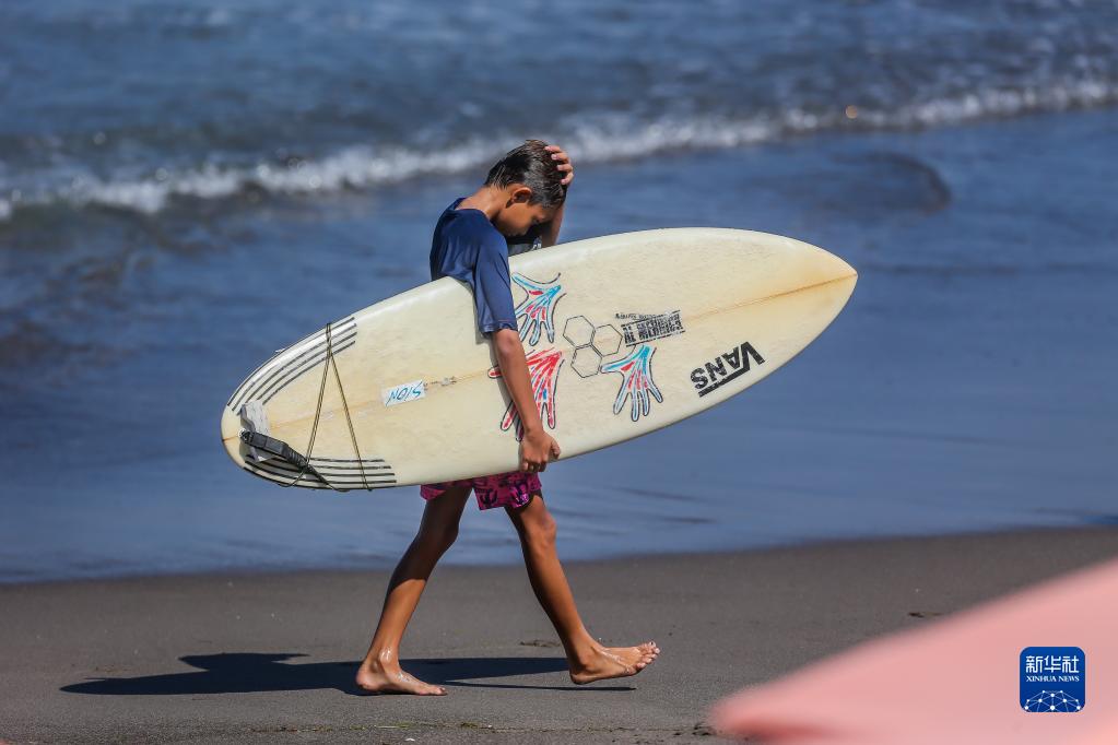 10月30日,一名拿着冲浪板的男孩走在菲律宾拉乌尼翁的海滩。