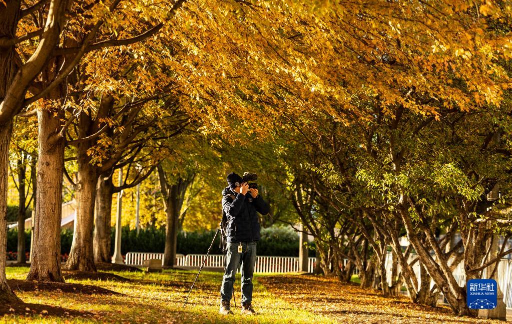 11月2日,一名摄影师在美国芝加哥拍摄秋景。