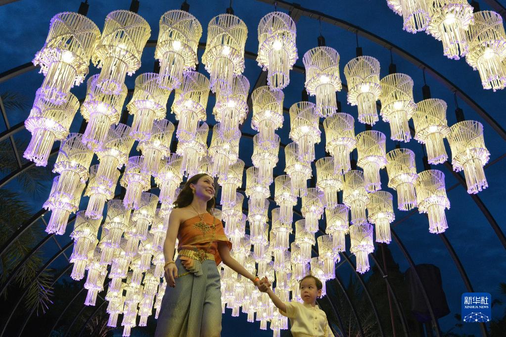 11月8日,游客在泰国北榄府举行的国际灯笼美食节预展活动上观赏灯笼。