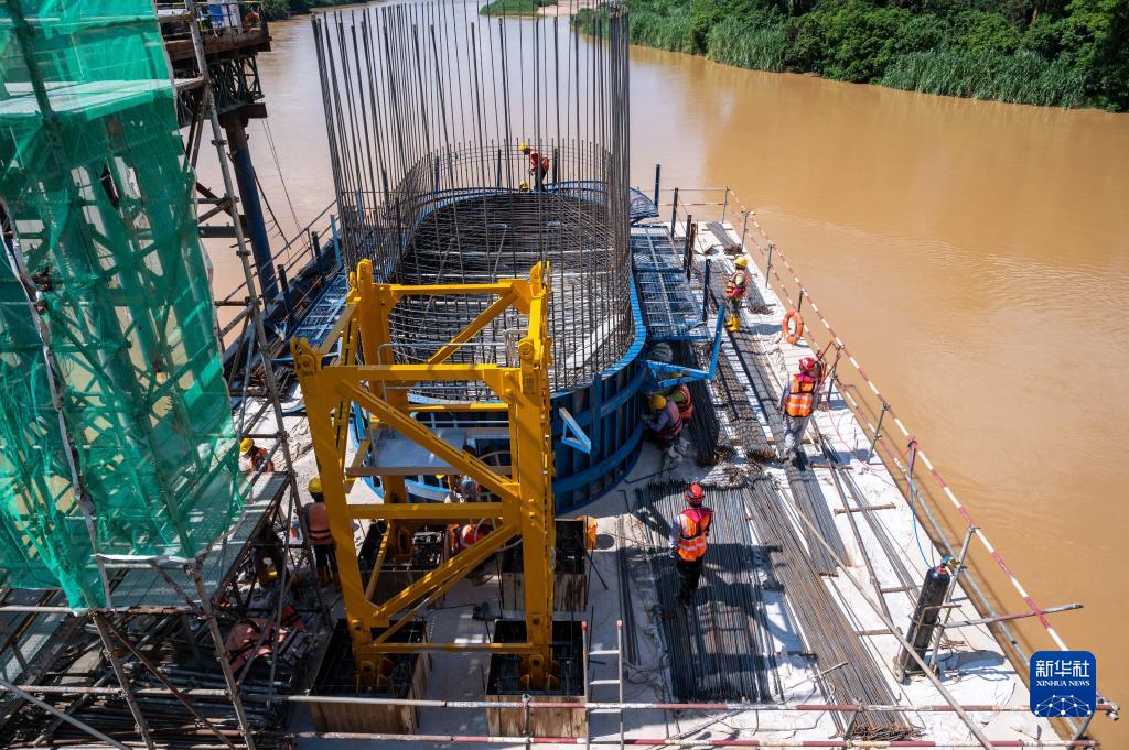 11月9日,在马来西亚彭亨州淡马鲁县,工人在马东铁项目30号桥工地上工作(无人机拍摄)。新华社记者 朱炜 摄