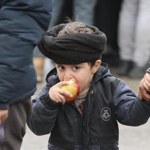11月19日,难民儿童在白俄罗斯与波兰边境白方一侧领取食物。