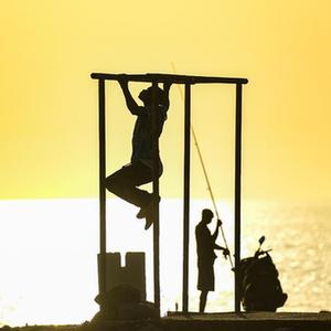 11月23日,人们在塞内加尔首都达喀尔的海边使用健身器械。