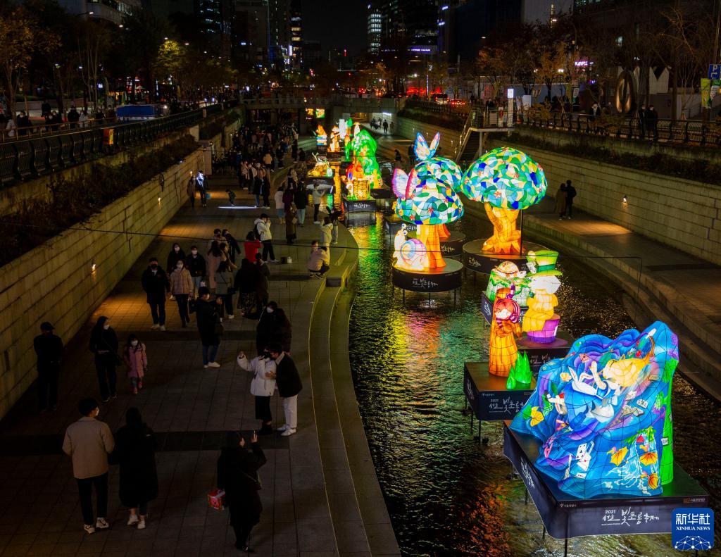 一年一度的首尔花灯节26日在首尔清溪川广场拉开帷幕,各式彩灯吸引人们驻足观看。