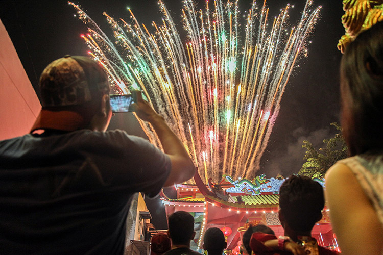 People watch fireworks during an activity greeting the Chinese Lunar New Year in Medan, Indonesia, Jan. 25, 2020. (Xinhua/Alberth Damanik)