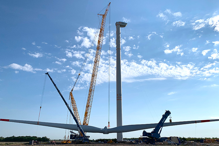 Workers install a turbine blade at the construction site of a wind farm in Kostanay, Kazakhstan, Aug. 28, 2020. The wind farm is built and run by Chinese green power developer Universal Energy. (Xinhua)