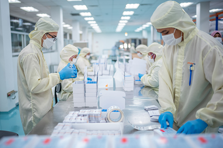 2021年10月5日,工人在马来西亚吉隆坡郊区的发马公司灌装工厂包装本地灌装生产的中国科兴新冠疫苗。