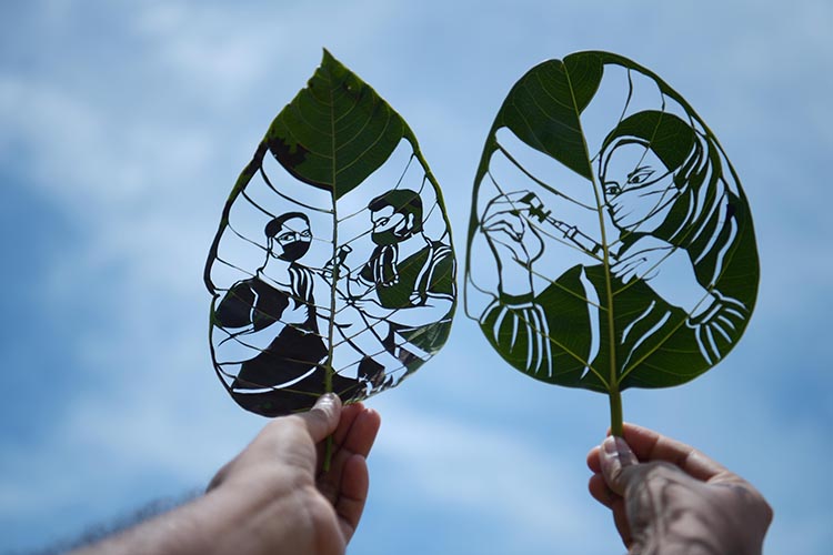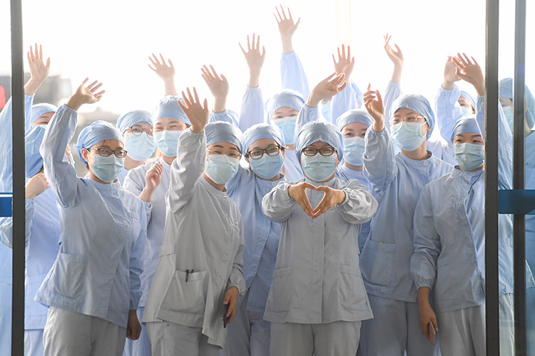 Medical staff from Wuhan No. 1 Hospital gesture to bid farewell to a medical assistance team from Guangdong Province at the Wuhan Tianhe International Airport in Wuhan, central China's Hubei Province, March 23, 2020. (Xinhua/Chen Yehua)