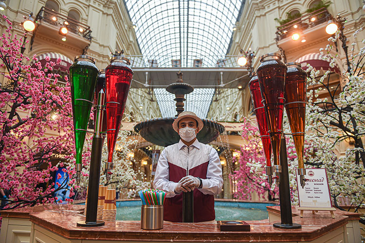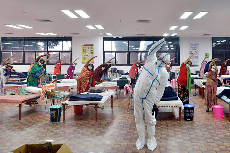 2020年3月23日,中国湖北省武汉市第一医院医务人员在武汉天河机场为援鄂医疗队送行。