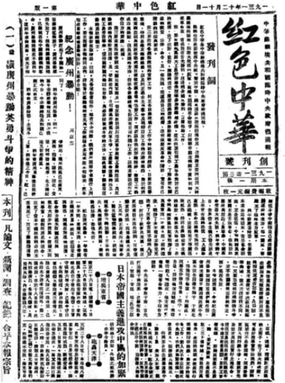 1931年12月11日,中华苏维埃共和国临时中央政府机关报《红色中华》报创刊,与红中社一套人马,两块牌子。发行量最高时突破四万份。刊头是由首任主笔周以栗题写的。