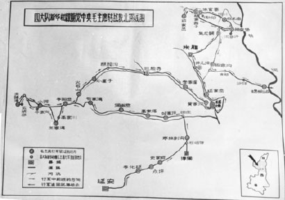 1947年,中共中央撤离延安后,新华社一部分人员由副总编辑范长江率领组成工作队,代号“四大队”,跟随毛泽东同志和党中央转战陕北。图为“四大队”转战陕北路线图。