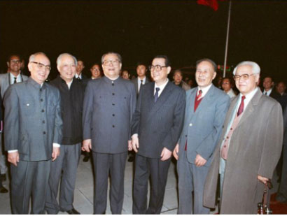 1989年10月1日,中共中央总书记江泽民、国务院总理李鹏在天安门城楼,与新中国成立后新华社四任社长吴冷西、朱穆之、曾涛、穆青合影。