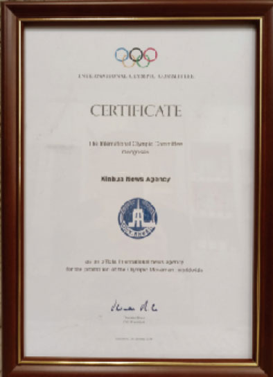 2019年1月,国际奥委会主席巴赫访问新华社时宣布,新华社成为国际奥委会认可的国际通讯社。2019年4月12日,国际奥委会向新华社递交的国际通讯社证书。新华社成为30多年来国际奥委会唯一新承认的、第一家非西方的国际通讯社。