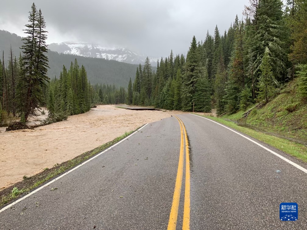 美国国家公园管理局6月13日发布的照片显示黄石国家公园东北入口的受损道路。