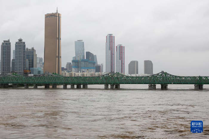 这是8月9日在韩国首尔拍摄的受强降雨影响而水位上涨的汉江。