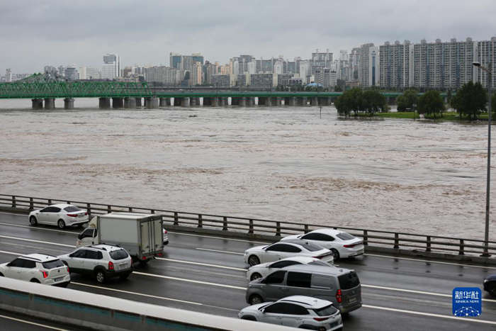 8月9日,车辆在韩国首尔的沿江公路上行驶,旁边是受强降雨影响而水位上涨的汉江。