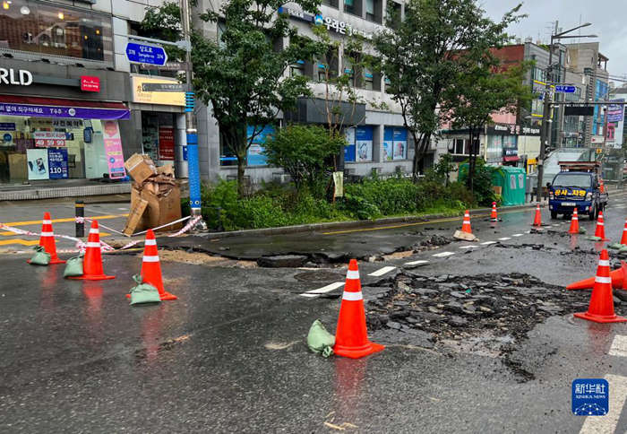 这是8月9日在韩国首尔拍摄的因遭遇强降雨而受损的道路(手机拍摄)。