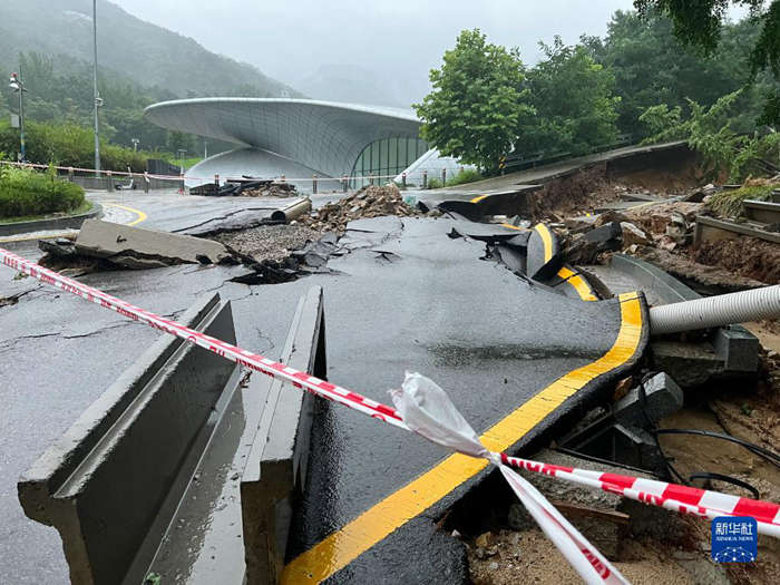 这是8月9日在韩国首尔大学拍摄的因遭遇强降雨而受损的道路(手机拍摄)。