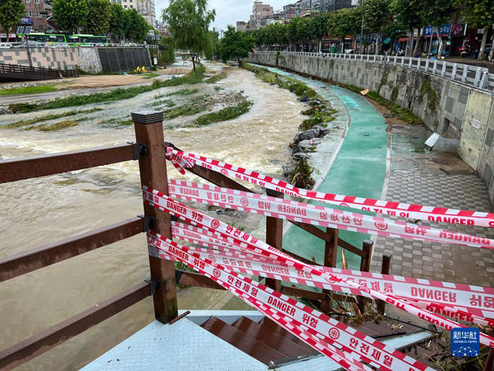 8月9日,受强降雨影响,韩国首尔一条河流旁的人行步道被封闭(手机拍摄)。