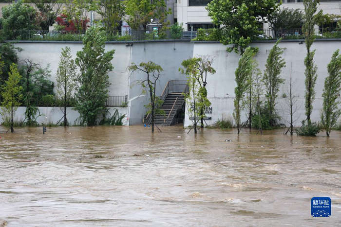 8月9日,受强降雨影响,韩国首尔汉江水位上涨,岸边树木和楼梯被淹。
