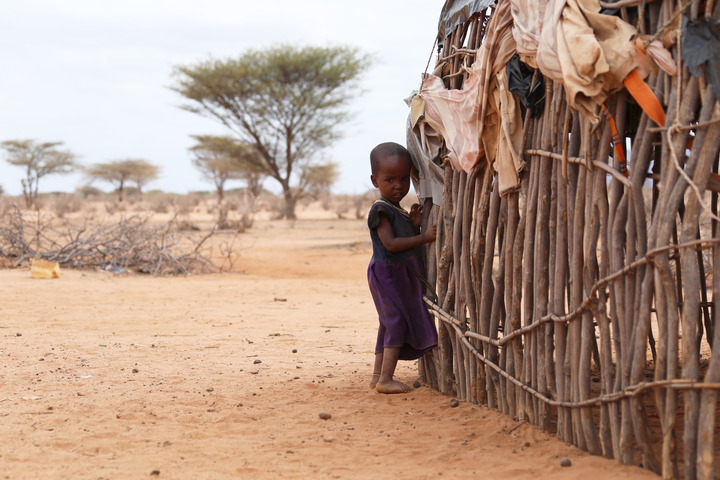 8月26日,一名儿童站在肯尼亚马萨比特郡莱萨米斯镇一干旱的村庄内。新华社记者董江辉摄