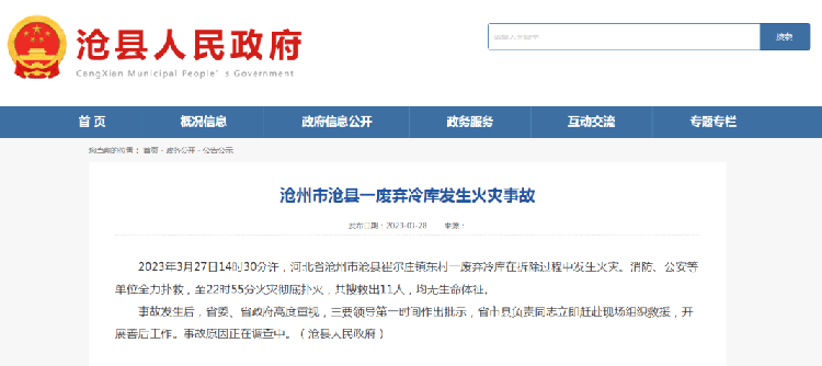 2023年3月27日14时30分许,河北省沧州市沧县崔尔庄镇东村一废弃冷库在拆除过程中发生火灾。消防、公安等单位全力扑救,至22时55分火灾彻底扑灭,共搜救出11人,均无生命体征。