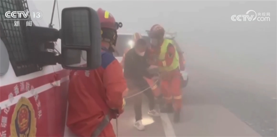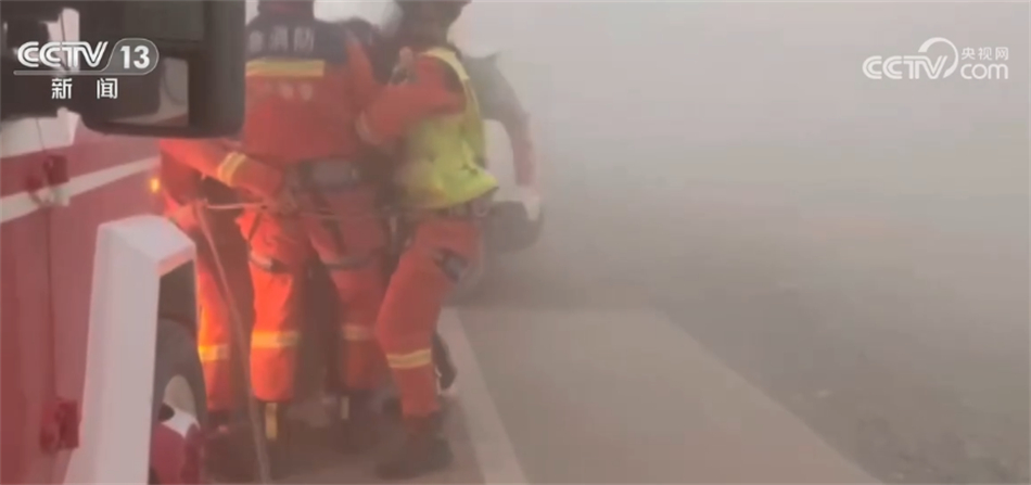 由于风区瞬时风力可达11级以上,一路上黄沙漫天,飞沙走石,视距最差时不足5米,前进困难重重。消防员确定被困人员的数量和位置后,利用绳索牵引,用身体为被困人员搭起挡风墙,护送被困人员上车。经过紧张救援,5名被困人员安全脱险。