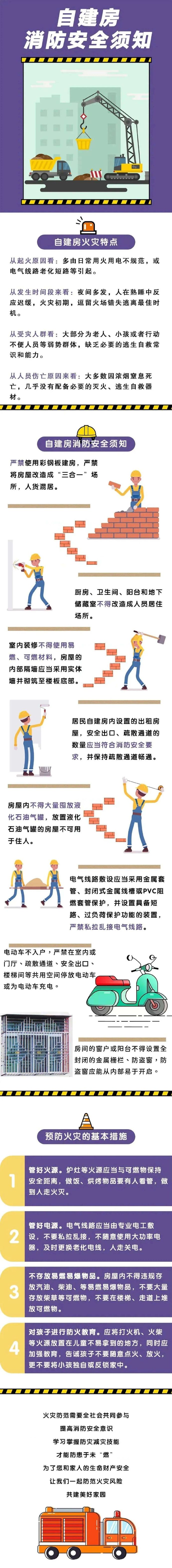 违规住人、违规用火用电、疏散通道堵塞、违规使用易燃可燃材料、电动车违规停放、入户充电……都是导致自建房火灾,特别是经营性自建房火灾高发的主要原因。那么如何防范居民自建房火灾呢?看图了解↓↓