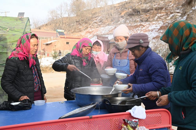积石山县柳沟乡张郭家村的村民在帐篷外盛饭(12月20日摄)。新华社记者 范培珅 摄