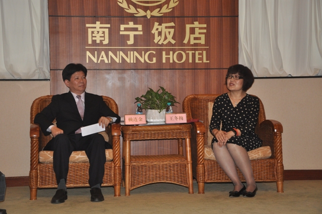 中国记协书记处书记王冬梅(右)与访问团团长赖连金亲切交流 沈毅兵 摄