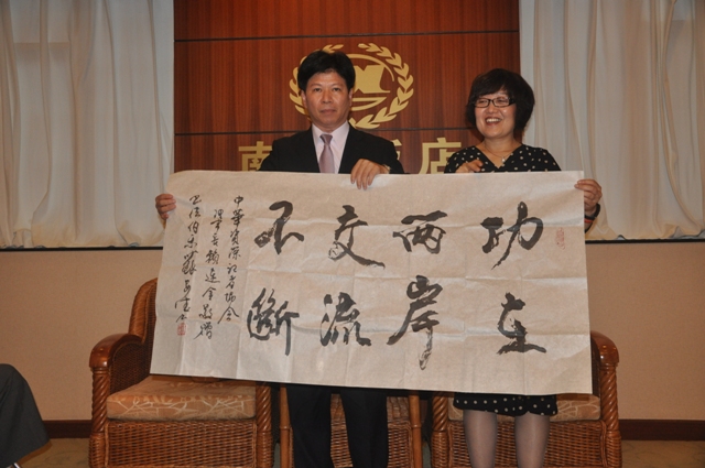 中华资深记者协会理事长赖连金(左)向中国记协赠送字画 沈毅兵 摄