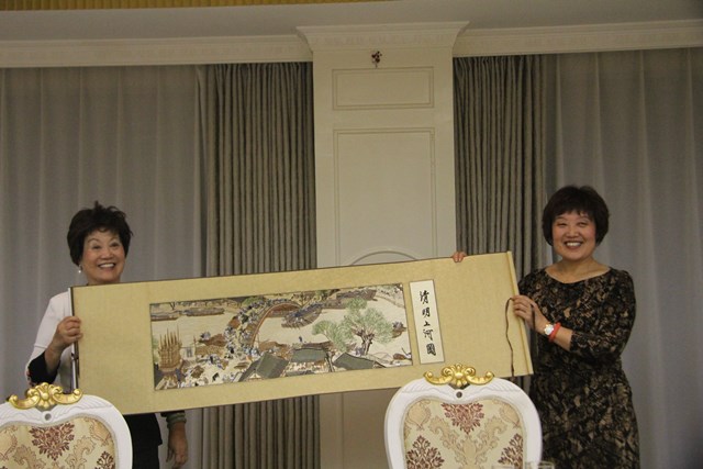 中国记协书记处书记王冬梅(右)向访问团赠送纪念品 黄娜 摄