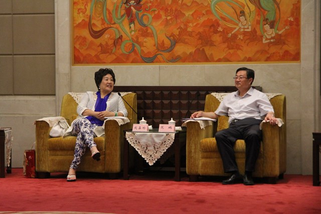 甘肃省委宣传部副部长范鹏(右)会见访问团并介绍甘肃发展情况 黄娜 摄