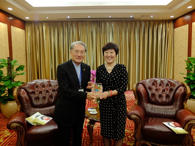 台湾中华广播商业同业公会理事长马长生(左)代表访问团向王冬梅书记赠送礼品 杨坤 摄