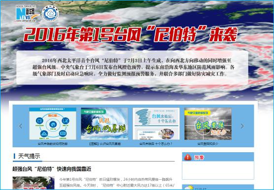 中国气象网上线专题《2016年第1号台风“尼伯特”来袭》。截止6日中午,共发布《今年第1号台风“尼伯特”在西北太平洋洋面上生成》《郑国光对近期强降雨和台风预报服务工作提出要求》《今年第1号台风“尼伯特”增强为强热带风暴级》《台风预警升级为橙色“尼伯特”逐渐向台湾东部沿海靠近》等相关新闻稿件以及《台风防御科普知识》《防御台风的三个阶段》《台风会带来哪些灾害?》《三个小锦囊对付台风不用慌》《风力的等级划分》《台风预警发布后,我们怎么办?》等防灾科普文章共计29篇,被新华网、人民网、环球网、紫光阁、搜狐、新浪等媒体广泛转载。