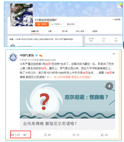 中国气象局官方微博、微信共发布相关信息22条,涉及台风预警、应急、科普等内容,其中开设的“1号台风尼伯特”微博话题,截至6日10时,阅读量已达124万。