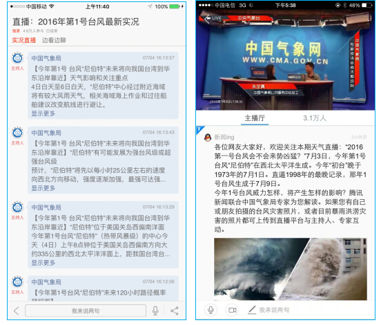 中国气象局8大政务客户端截止6日12时共发布台风相关预警17条、科普信息11条。3日16时,启动腾讯视频直播“追击2016年第一号台风”,连线现场记者实现双线路切换视频直播,在线用户达到10万人次,腾讯新闻、搜狐新闻客户端图文、语音同步直播,关注度达7.7万人次。