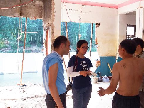 记者林若箐(左二)在红安县华家河镇山洪险情现场采访受灾群众卢祖明