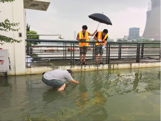 老记者缪宜江在太湖排洪通道望虞河闸下水文站涉水拍摄