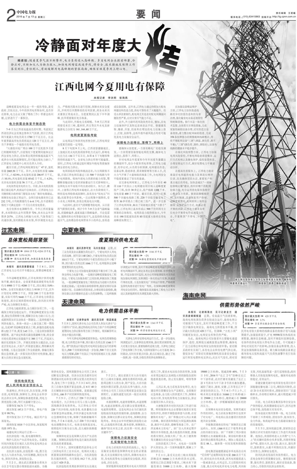 例如,在8月25日一版刊登的“致敬!高温下的电力人”报道。此前一天,报社陆续收到了四川、重庆、湖北、河南省电力公司的战高温来稿,无一例外都是对当前高温情况的介绍和电网企业的应对措施。经过整合加工,编辑把几篇动态消息进行组合,精做导语,把不同电力企业应对高温所做工作的亮点做成标题,最终形成了一篇综述,辅之以图片报道,重点突出,亮点鲜明,体现了编辑的策划意识,整篇报道也更具可读性。
