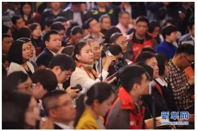 2016年3月2日,全国政协十二届四次会议新闻发布会现场,记者正在进行VR拍摄。新华网/中国政府网陈杰 摄