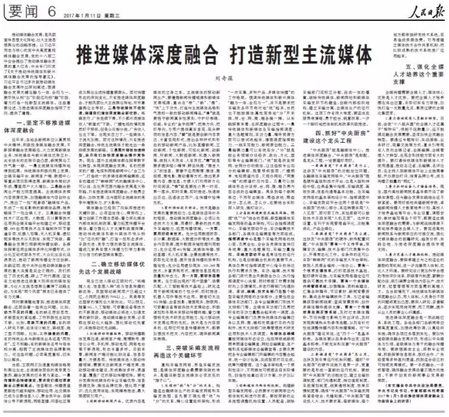 今日出版的《人民日报》刊登了中共中央政治局委员、中央书记处书记、中宣部部长刘奇葆的署名文章《推进媒体深度融合 打造新型主流媒体》,摘录了刘奇葆同志2017年1月5日在推进媒体深度融合工作座谈会上的讲话。讲话提出了五个方面的要求:坚定不移推进媒体深度融合确立移动媒体优先这个发展战略突破采编发流程再造这个关键环节抓好“中央厨房”建设这个龙头工程强化全媒人才培养这个重要支撑