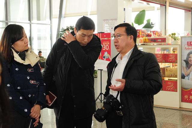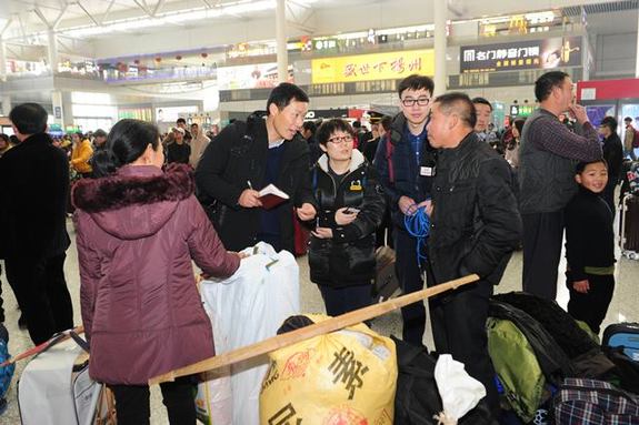 2月13日春运首日,《人民铁道》报社总编辑毕锋(右一)在上海虹桥站采访。 安林 摄
