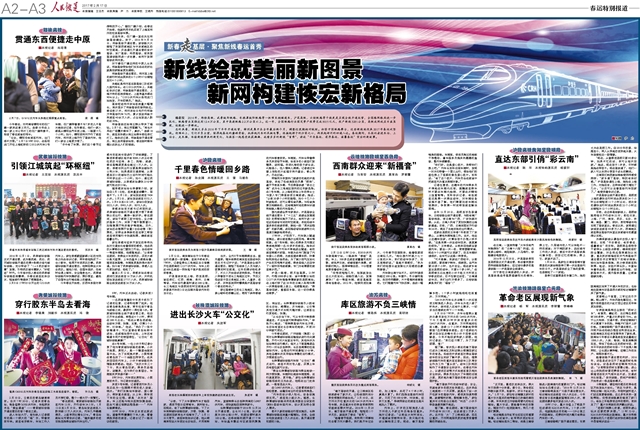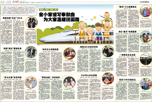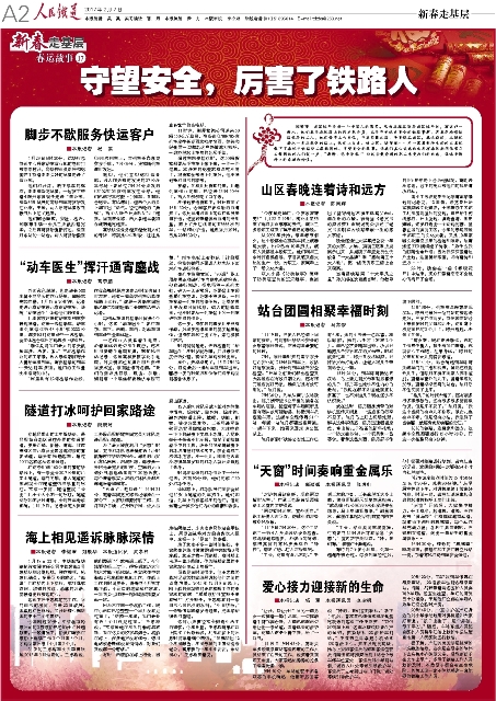 做好特别报道。从春运开始至2月15日,结合“新春走基层”活动,已推出4个视觉新闻版、4个连版报道和3个整版特别报道。其中,1月23日,二三连版推出特别报道《新春走基层•开往故乡的列车》,讲述旅客返乡途中暖心的故事;2月7日,二版推出“新春走基层”整版特别报道《守望安全,厉害了铁路人》,讲述铁路职工坚守工作岗位、守卫团圆之路、平安送客回家的故事;2月11日,二三连版推出特别报道《新春走基层•春运一家人》,讲述春运中铁路“父子兵”“夫妻档”的故事;2月14日,四版推出视觉新闻版《新春走基层•欢快的旅程》,由摄影记者跟车报道k4170次列车在元宵节的欢快旅程。