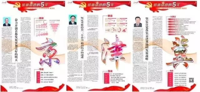 在创新、协调、绿色、开放、共享、党建等主题的引领下,5期特刊集中展示北京、天津、河北、山西和辽宁在砥砺奋进的5年中所取得的巨大成就。特刊的封面和头条,都统一刊发地方主要领导的署名文章,阐释在以习近平同志为核心的党中央领导下开创出的新局面;特刊2-7版都是共同主题的分别展示;特刊8版的封底则都是用图片反映当地发展建设的奋进步伐,较好地显示出策划的统一性与整体性。
