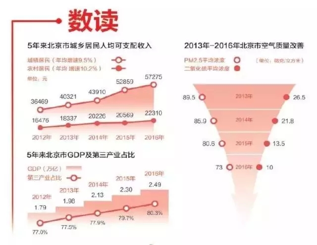 北京篇头版的“数读”,选取人们最为关注的3组数据,反映5年来城乡居民人均可支配收入、5年来 GDP及第三产业占比和2013年-2016年空气质量改善情况,展示成绩,一目了然。